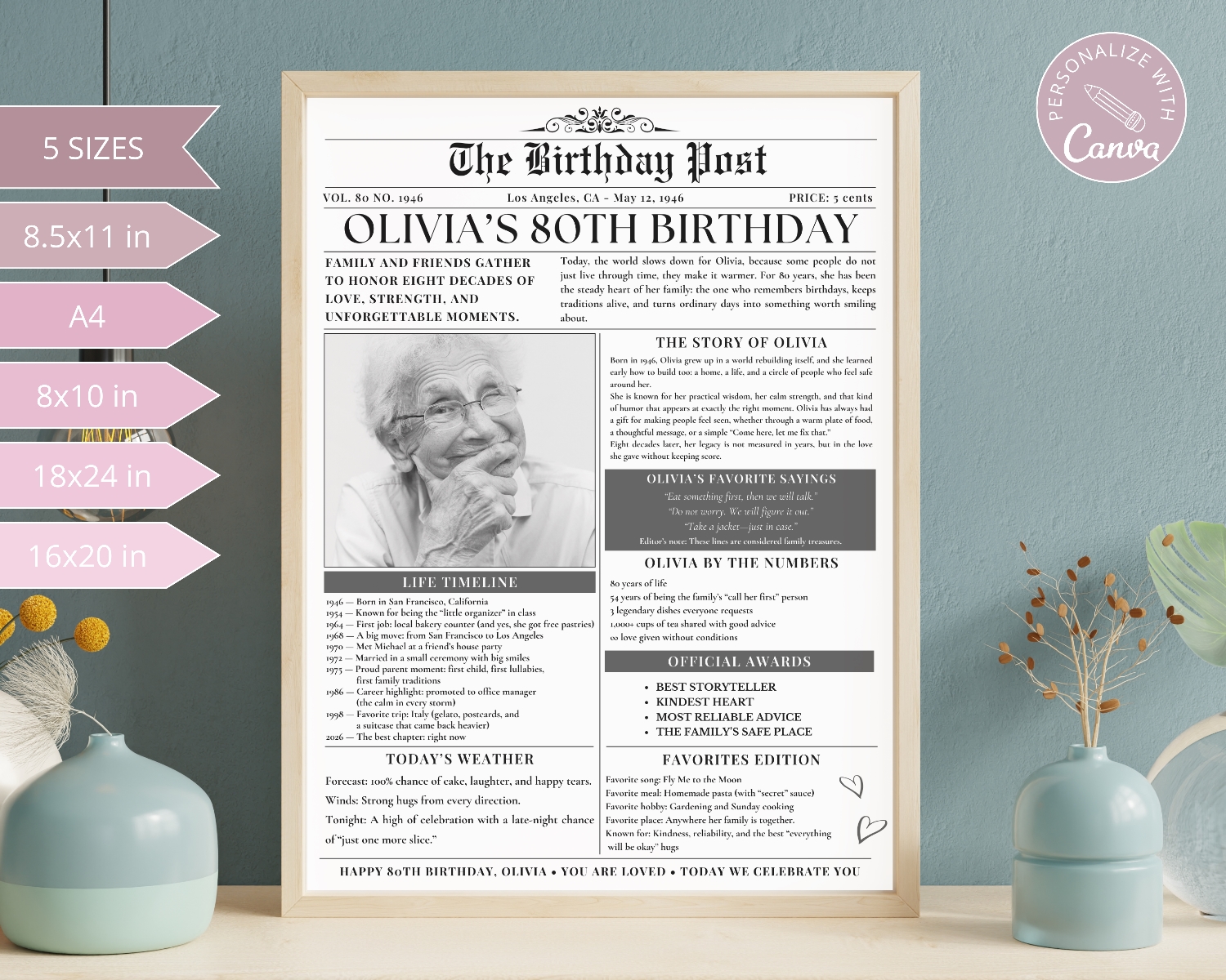 This fully editable Canva template serves as a heartwarming 80th birthday gift for grandma or grandpa, allowing you to personalize their life timeline with photos and facts from 1946. Create a stunning milestone birthday poster that doubles as a nostalgic keepsake and beautiful party decor. Available as an instant digital download, it’s the perfect last-minute solution for a truly personalized celebration!