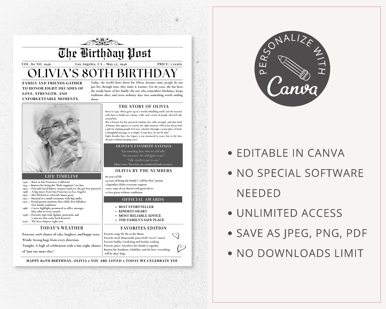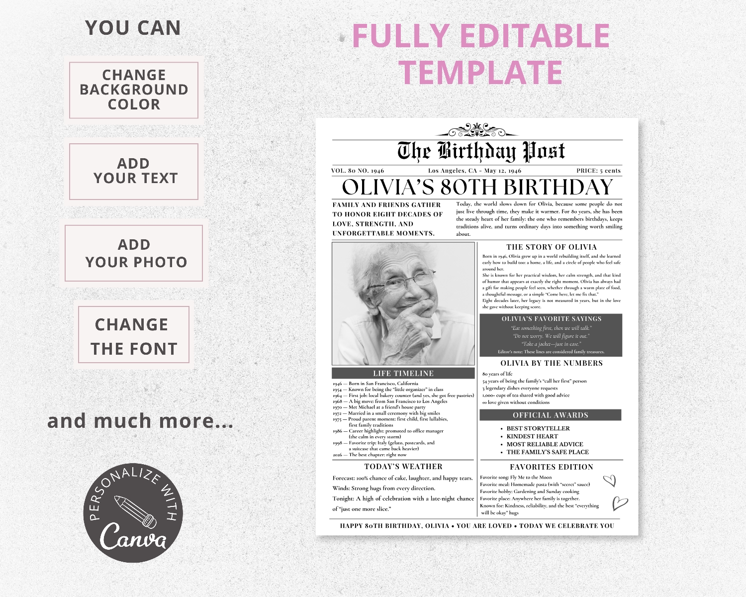 - Fully editable 80th Birthday Newspaper Template in Canva