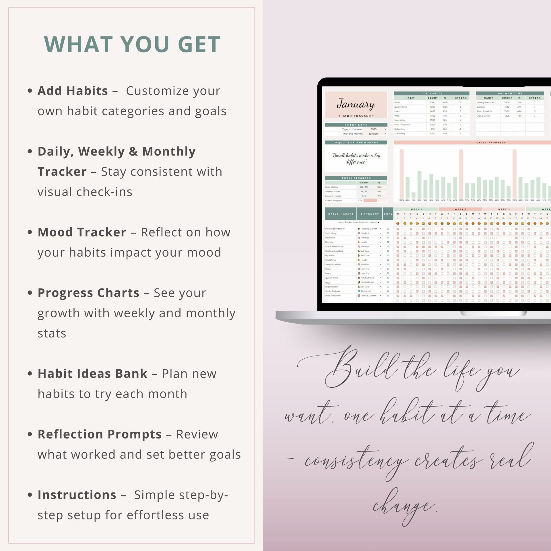 Stay on track with your goals using this easy-to-use Habit Tracker for Google Sheets!