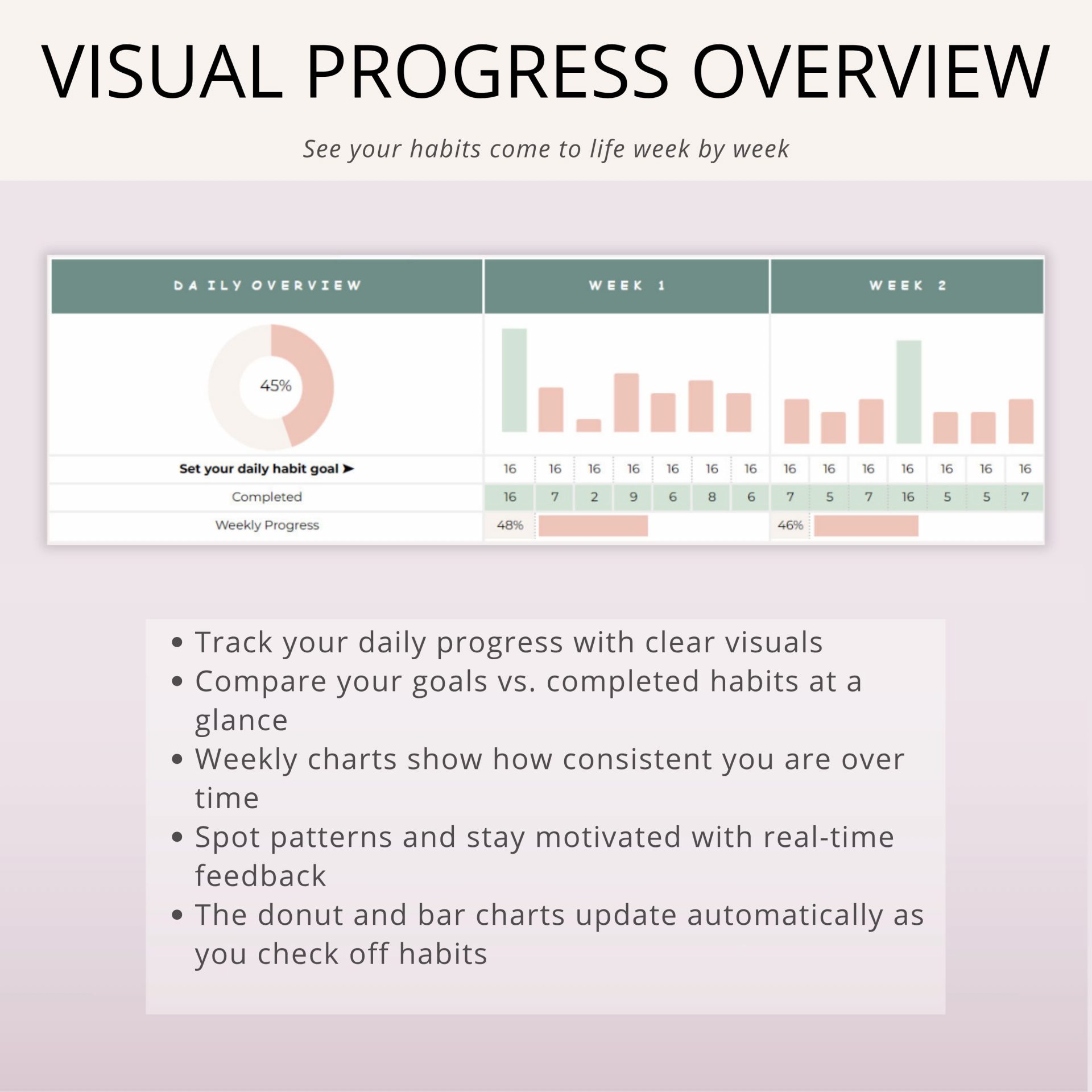 Whether you’re building a wellness habit track, following an ADHD habit tracker system, or just need a clean and cute habit tracker to stay motivated, this spreadsheet template has you covered. With visual charts, automatic progress tracking, and dedicated space for your goal setting tracker, this tool makes productivity fun and simple.