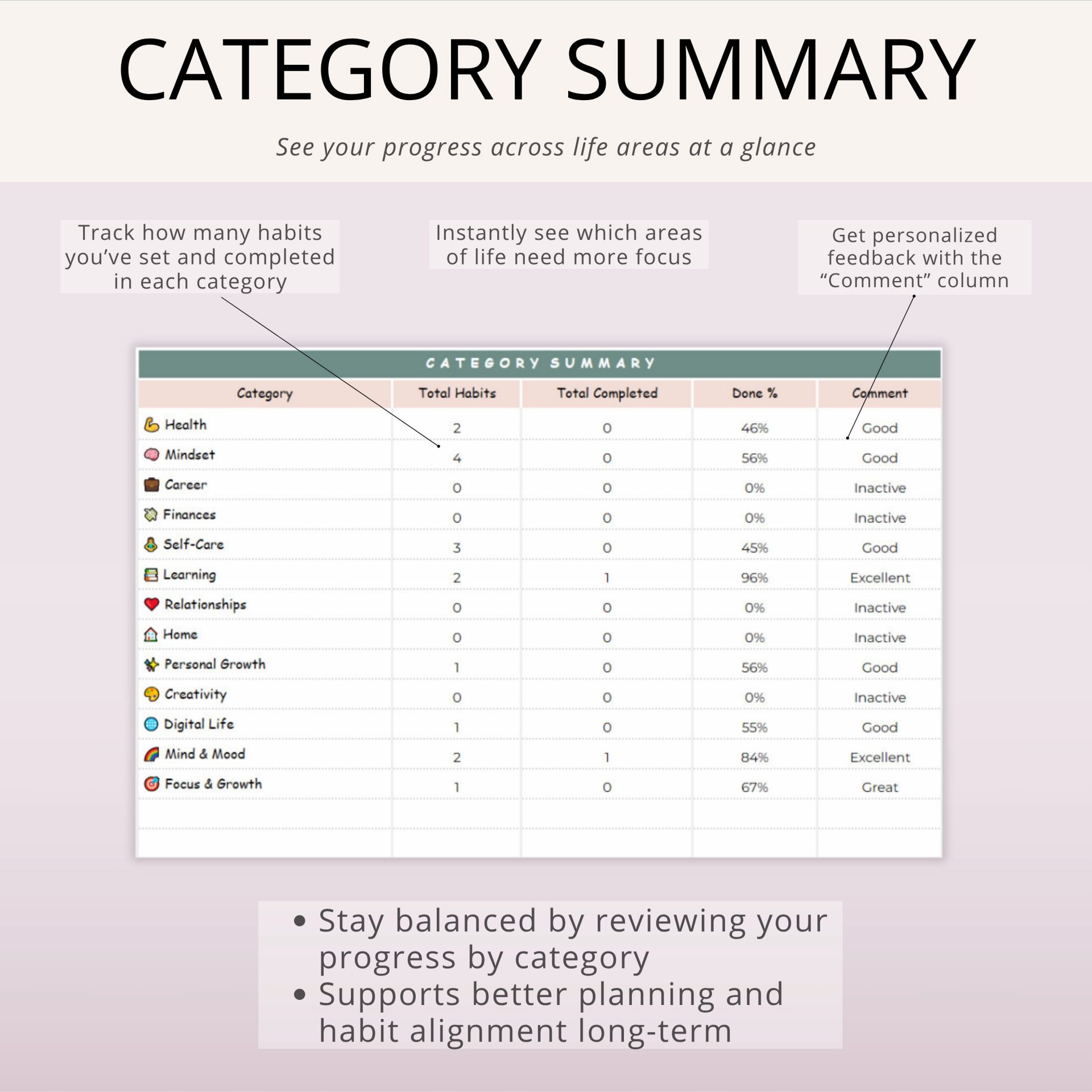 - Category summary dashboard to see balance across life areas (wellness, work, self-care, etc.)