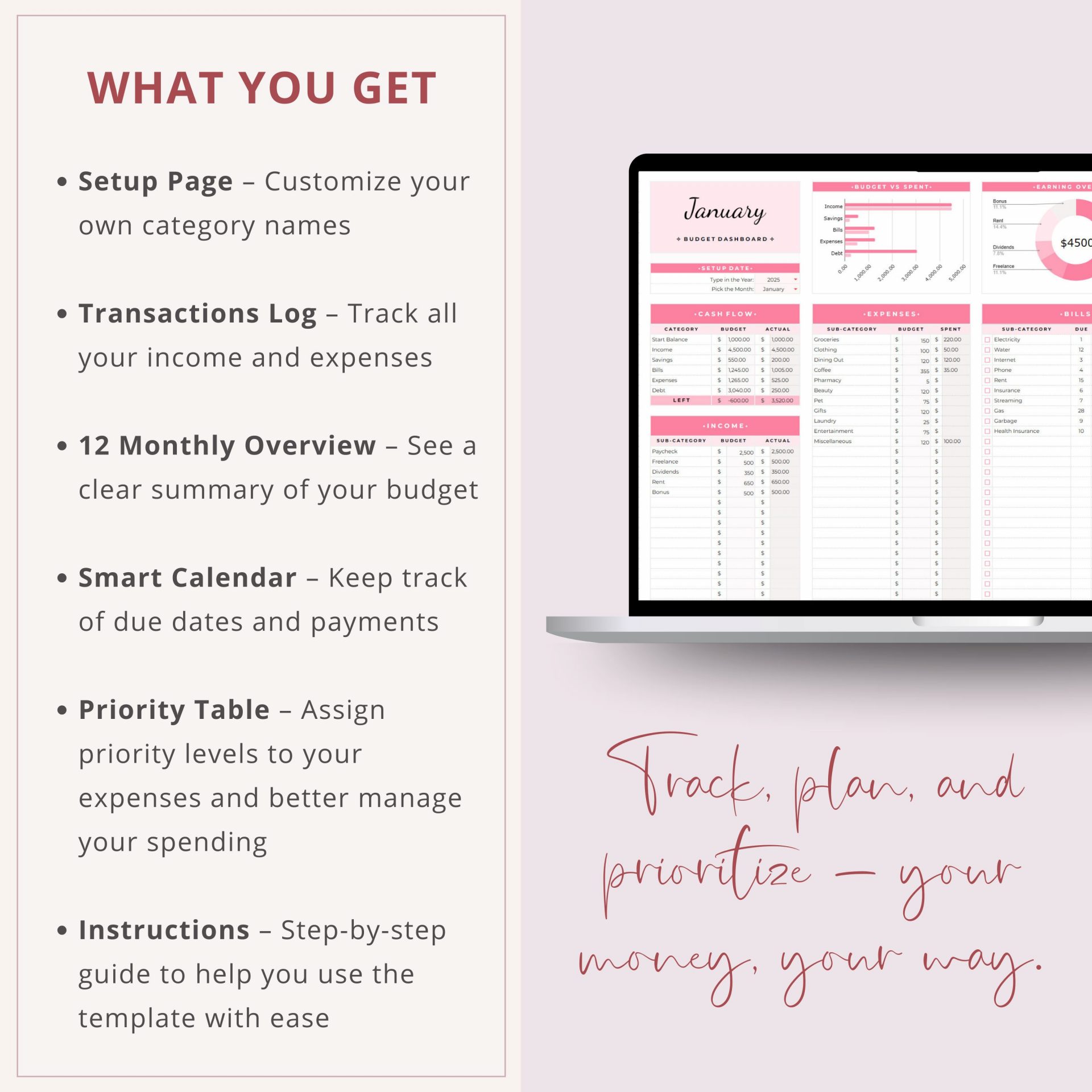 15 organized tabs included: Setup, Transaction Log, Priority Tracker, Smart Bill Calendar, Savings & Debt trackers + 12 monthly dashboards