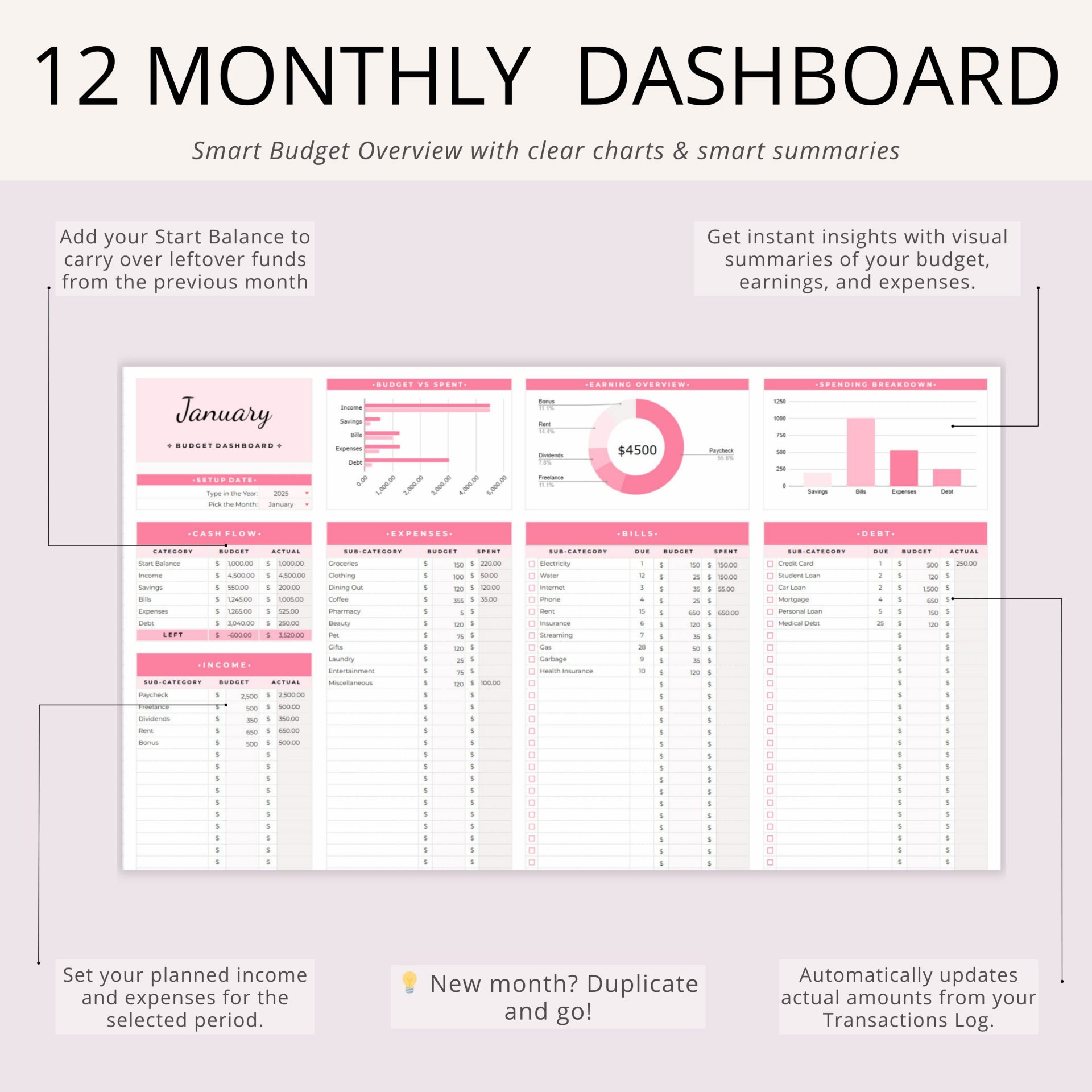 This monthly budget planner includes 15 organized tabs: Setup, Transaction Log, Bill Calendar, Savings & Debt trackers, and 12 monthly dashboards with charts.
