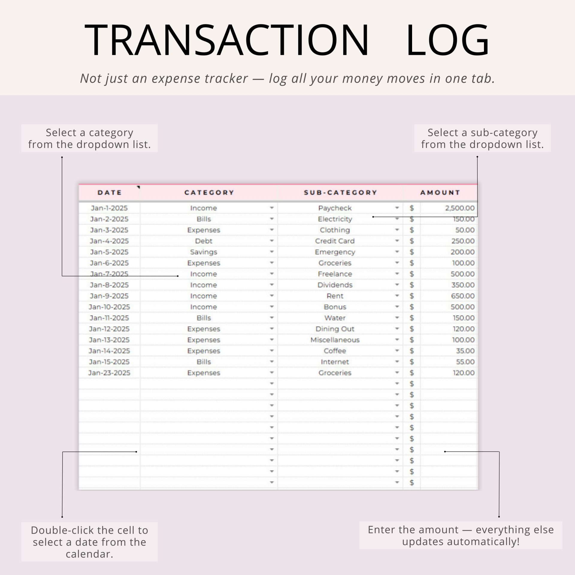 Fully editable in Google Sheets (not locked) — customize categories, colors, currency, and layout in minutes.