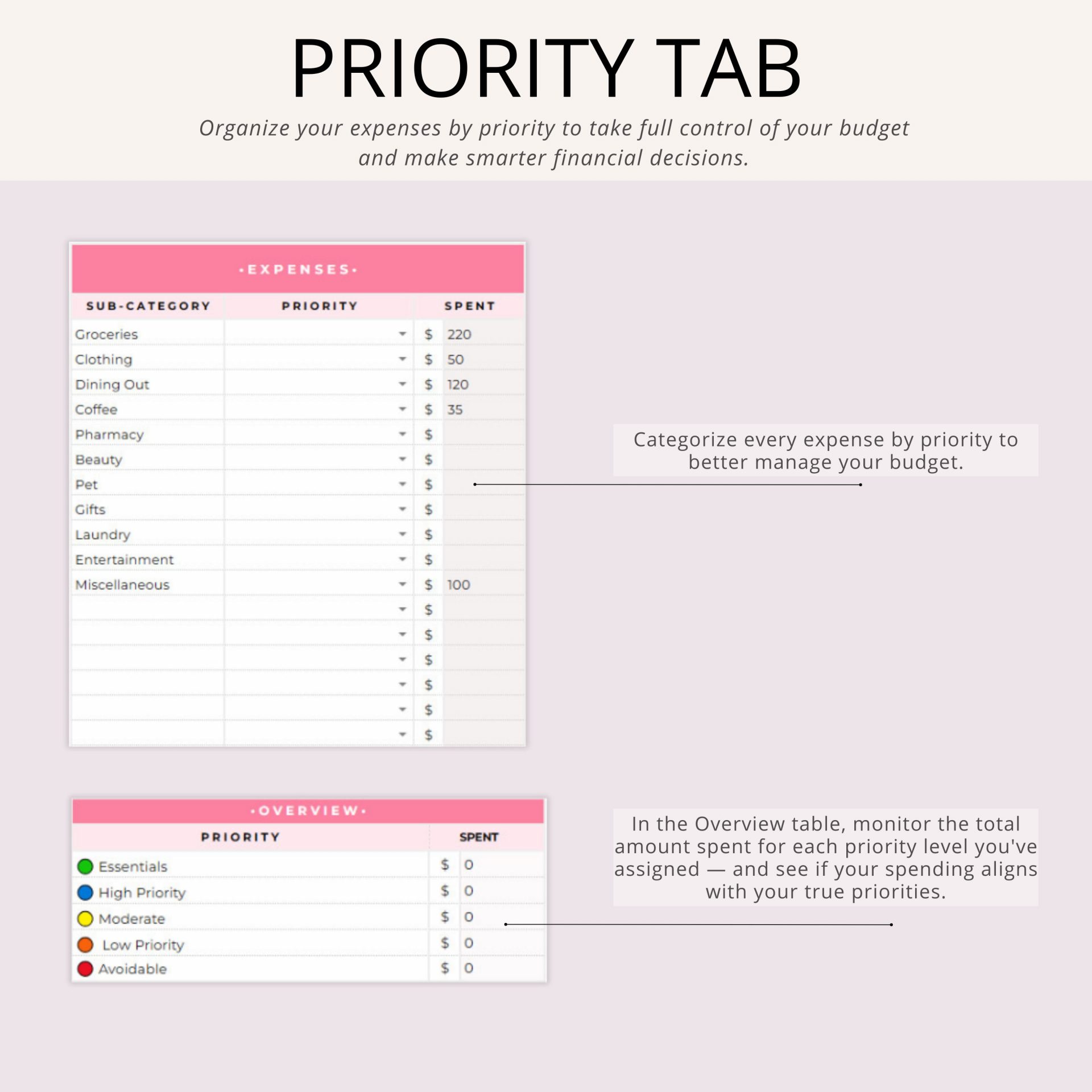 • Priority Tracker – Assign priority to each expense for mindful spending