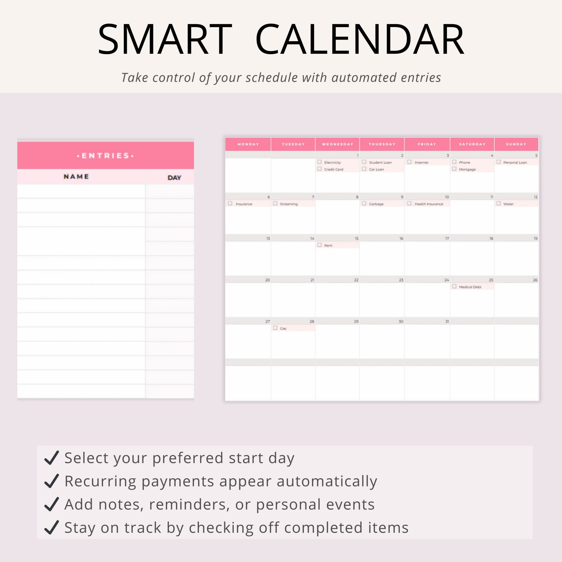• Smart Bill Calendar – Keep up with due dates and income