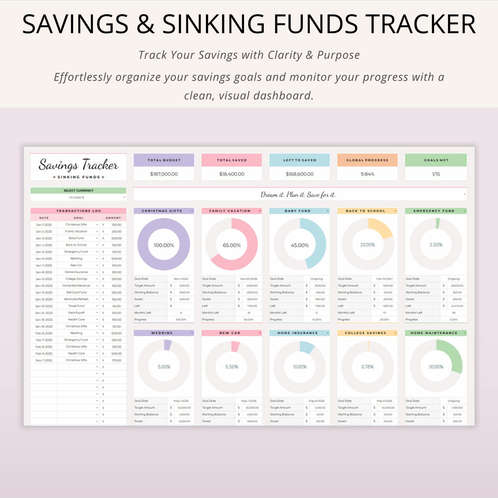 This powerful Sinking Funds Tracker Spreadsheet is your ultimate Personal Budget Planner designed specifically for Google Sheets. Easily manage specific savings goals (Sinking Funds) and track all expenses using the integrated Finance Dashboard.