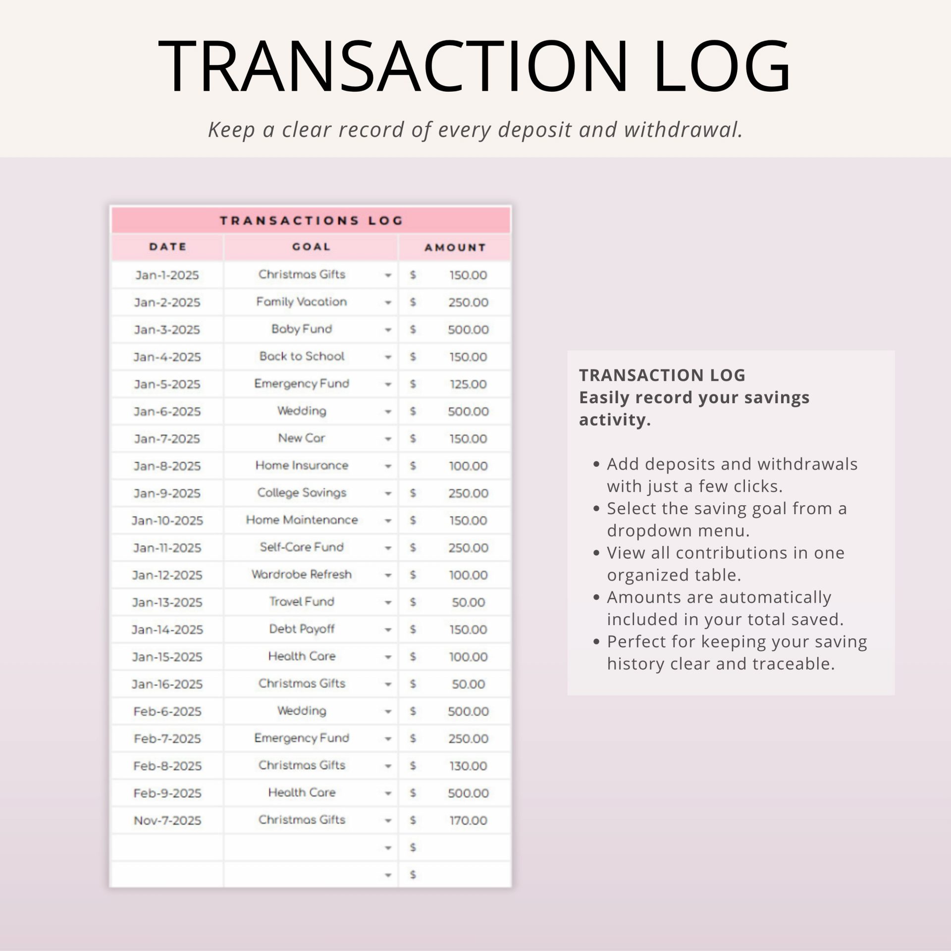 - Transaction Log – Record all deposits and withdrawals