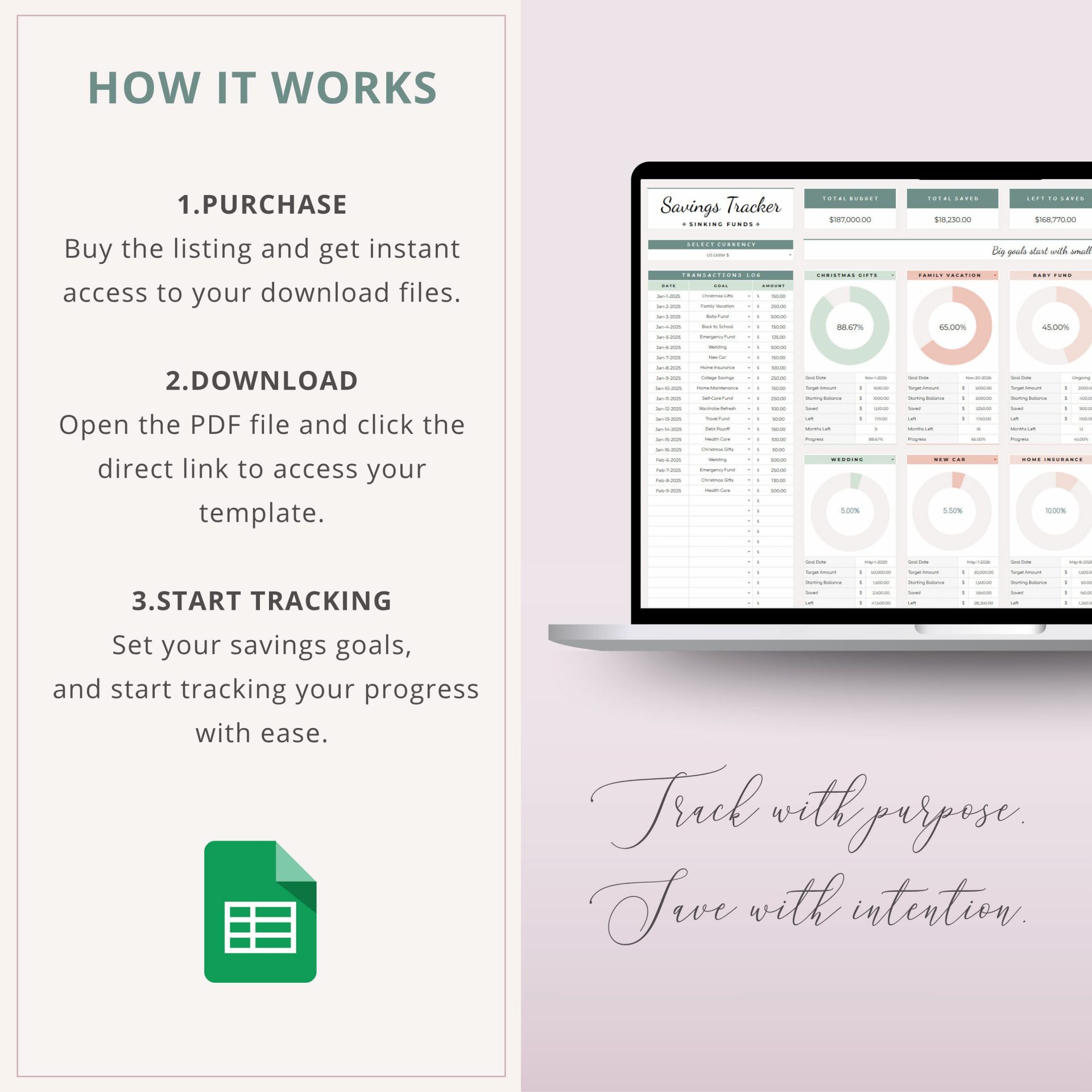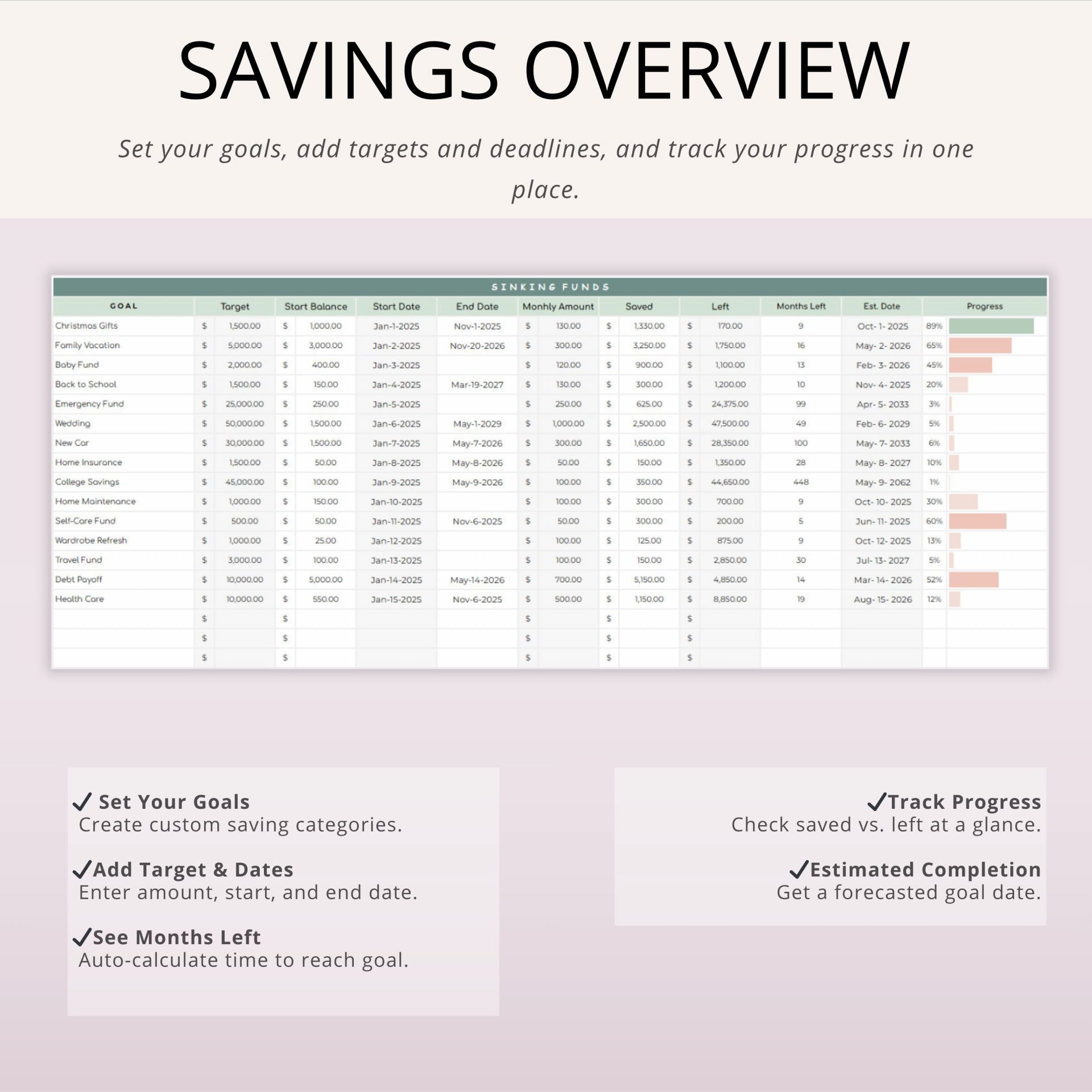 Reach your financial goals faster with this automated Sinking Funds Tracker for Google Sheets. Designed as an intuitive finance dashboard, this savings tracker helps you visualize your progress, manage emergency funds, and plan future expenses stress-free. It is the perfect customizable budget spreadsheet that does all the math for you. Instant digital download.